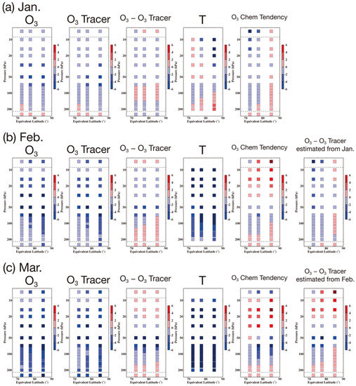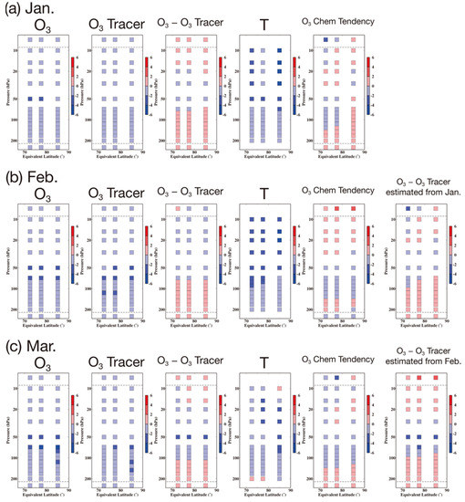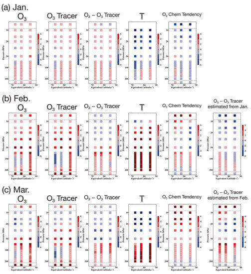 The panels in the sixth column of Figure 8 highlight the difference in the partial column anomaly between the chemically active ozone and the passive ozone tracer estimated based on the anomalies in the preceding month. The anomalies in February are estimated by adding the monthly mean chemical ozone tendency in January (the top panel in the fifth column in units of DU/month) multiplied by 1.0 month with the difference between the chemically active ozone and the passive ozone tracer in January (top panel in the third column). Similarly, the anomalies in March are estimated based on the middle panels in the fifth and third columns for February. These results indicate that the anomaly distribution of the third column is similar to that of the sixth column, especially at pressure levels of 30–100 hPa. It is confirmed that the differences between the chemically active ozone and the passive ozone tracer in February and March are roughly reproduced by the anomalies and chemical tendency in the preceding month, i.e., January and February, respectively.