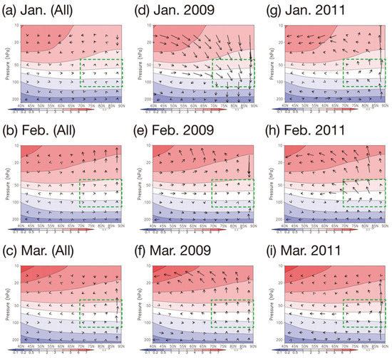 Residual mean meridional circulation anomaly for the QBO-W/Smin years in (a) January, (b) February, and (c) March. The vertical component of the residual circulation is magnified by a factor of 200 relative to the horizontal component, and the scale for the horizontal vector is shown at the bottom right of the panel in units of m/s. The contours/shadings indicate the ozone mixing ratio averaged for 1979–2011 with units of DU. (d–f) Same as (a–c), respectively but for anomalies in 2009. (g–i) Same as (a–c) but for anomalies in 2011.