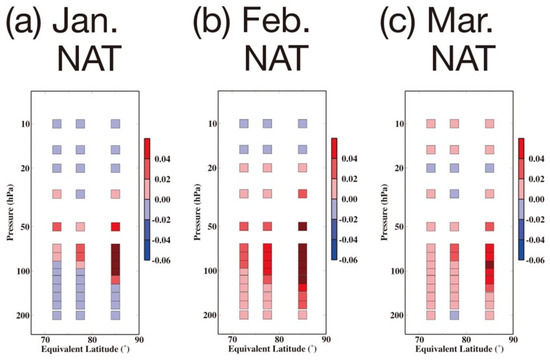 The panels in the fourth column in Figure 8 show the temperature anomaly. The negative anomalies between −2 K and −4 K are evident within 70–90° N in the lower and middle stratosphere in February but within a smaller region in March. The panels indicate the negative anomalies in the QBO-W/Smin phase in almost all regions at 70–90° N and 10–200 hPa. In regard to chemical ozone change, a negative anomaly in temperature should cause a negative anomaly in ozone in the lower stratosphere where heterogeneous reactions may occur, because additional PSCs are expected to form at lower temperature. Meanwhile, a negative anomaly in temperature should cause a positive anomaly in the ozone at altitudes where only gas-phase chemical reactions occur, because gas-phase chemical reactions produce additional ozone at lower temperatures. The anomalies in the ozone chemical tendency (the fifth column) in February and March are consistent with these anticipated ozone anomalies owing to the gas-phase/heterogeneous reactions through the negative temperature anomaly. In the chemical tendency panels, the anomalies are shown in the units of DU month−1. The ozone chemical tendencies in February indicate negative anomalies in the lower stratosphere (50–130 hPa) and positive anomalies below and above these levels. In March, as opposed to February, negative anomalies are evident at 70–75° N above 50 hPa. Anomalies of the surface area of nitric acid trihydrate (NAT), which is the primary component of PSCs in the Arctic, are depicted in Figure 10. Large positive NAT surface area anomalies are evident in the Arctic lower stratosphere. The lager surface area of NAT caused large negative ozone anomalies in the Arctic lower stratosphere during February and March for the QBO-W/Smin years, as illustrated in Figure 8.