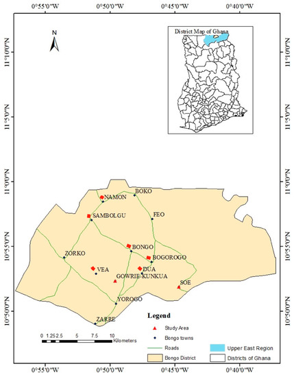 - District Coordinating and Planning Unit (DCPU). Strategic Environmental Assessment of Bongo District Medium-Term Development Plan from 2010–2013 under the National Development Plan; Bongo District Assembly: Upper East Region, Ghana, 2010; pp. 1–88.