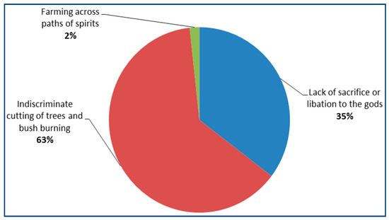 “(…) Like traditionally, the sacrifices…it is there. What I know is that; you know during every year people will normally farm and leave a certain space on the farm. That is the place to serve as the path for the spirits. It is for the spirits that pass through these spaces. But now, people farm virtually every place. So they farm and then block all these places. You see that they go and do consultations with the bogro and then they will realise that the gods are not happy because of the lack of zeal to allow these spaces. So, they go and make sacrifice to rivers and then clear all those areas for that place to be free for the spirits to pass through.”(Abire. Male Farmer, Age: 27 years, Bongo-Vea)