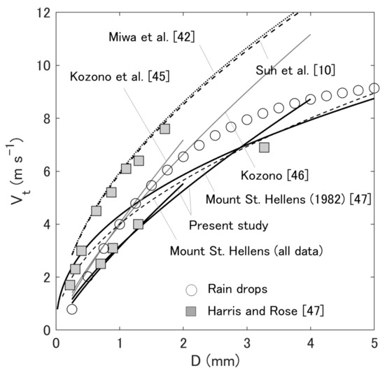 - Miwa, T.; Maki, M.; Kozono, T.; Fujita, E.; Tanada, T.; Iguchi, M. Experimental measurement on falling velocity of volcanic ash from Sakurajima volcano by using PARSIVEL disdrometer. Annu. Disas. Prev. Res. Inst. Kyoto Univ. 2015, 58, 91–94. Available online: http://hdl.handle.net/2433/210085 (accessed on 23 April 2021). (In Japanese with English abstract).