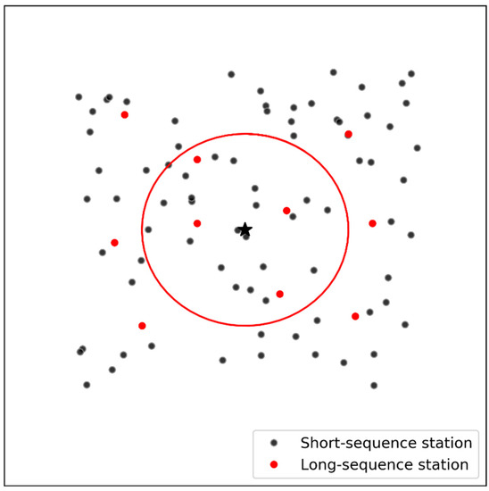 The regional averaging method (Section 2.3.2) and kriging interpolation method (Section 2.3.3) require a predetermined value N to determine the number of surrounding long-sequence stations. Affected by topography and other factors, stations with similar precipitation distribution functions are not necessarily distributed in a circle (for example, band structure). Therefore, the search for long-sequence stations cannot simply follow the circular pattern shown in Figure 2. Due to this, data from 2416 observation stations with long precipitation sequences were used to explore the best calculation strategy for short-sequence stations. The following method is used to search for the long-sequence stations around the short-sequence stations: (1) Use the KS distribution test to determine whether the monthly precipitation of the neighboring stations comes from the same distribution; that is, to determine whether the precipitation distributions of the two stations are similar. The top 50 stations that are closest to the precipitation distribution function of the central station are screened out. (2) The spatial distance between the stations is calculated from the longitude and latitude information of the stations, and the stations with too large a spatial distance in step 1 are eliminated based on the spatial distance information. The maximum distance is set at 400 KM in this paper. Figure 5 shows the stations with similar precipitation distributions as the representative stations (in Figure 1a) in September.