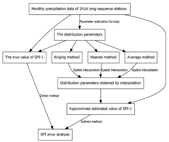 Based on the above three methods, the precipitation distribution parameters of short-sequence stations can be obtained, and then the SPI of short-sequence stations can be realized. It is worth noting that this method does achieve the calculation of SPI, but the error size of SPI and which method can be used to obtain the most accurate SPI is unknown. In order to investigate the reliability of calculating the SPI with short-term precipitation sequences in China, data from 2416 observation stations with long precipitation sequences were used for verification. First, the precipitation distribution parameters and SPI values for each station were obtained based on the real historical data, which were treated as true values. Second, assuming that each long-sequence station is also a short precipitation sequence, the three indirect methods (Section 2.3.1, Section 2.3.2 and Section 2.3.3) were used to obtain the precipitation distribution parameters and SPI values for each station. Then, the SPI obtained by the two ways can be compared, so as to realize the reliability evaluation of the three indirect methods. Finally, based on the best of the three indirect calculation methods, the SPI of more than 50,000 regional automatic stations was obtained and applied to drought monitoring in China, which will be compared with the drought monitoring results obtained from long-sequence stations to verify the actual monitoring effect of high-resolution SPI. A conceptual model illustrating the verification process is shown in Figure 3.