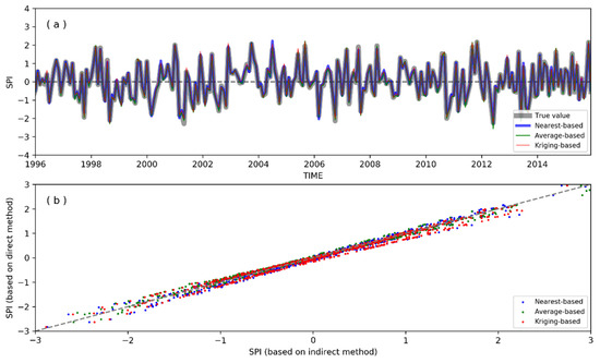 Comparison of real SPI values for station 54,906 with values obtained using different indirect methods. (a) SPI time series; (b) SPI-SPI plot.