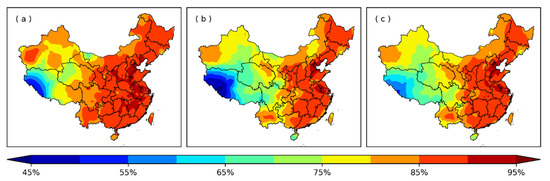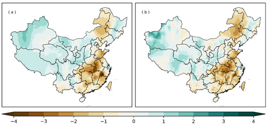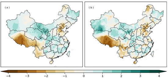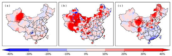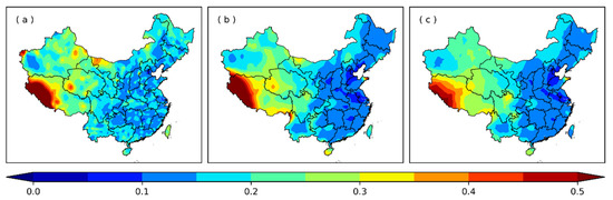 From the analysis in Section 3.1, it could be seen that the kriging method was better than the other two indirect methods, so Figure 9 only showed the results based on the kriging method. The value in Figure 8 is the rate of change compared to the real value (take parameter as an example: the value in Figure 9 a is calculated based on ). As shown in Figure 9, the distribution parameters and had much greater changes than , with increases of 30% in western China. The parameter error analysis of other months shows that the error of the distribution parameters has obvious seasonal characteristics, and the results show that the error is the smallest in summer and the largest in winter. In addition, the error of the distribution parameter has the smallest change with the season, and parameter has the largest change. Therefore, the estimation error of the distribution parameters and is the most important cause of SPI error.