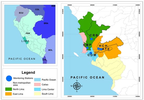 Peru is a highly urban country, reporting a higher density in Lima, considered one of the most polluted cities in LA []. The Department (second-level administrative subdivisions of Peru) of Lima is located on the central coast; it has a humid climate and a geography characterized by the Andes that reach the seashore at high altitudes. Its main source of air pollution is transportation units, as well as stationary sources such as industries, shops, and restaurants [,,]. In some areas the levels of air pollution are very high due to the traffic congestion of public transport, which mostly use diesel fuel, are old and do not have adequate maintenance [,]. Likewise, it is one of the cities with the highest frequency of asthma in children, caused by particulate matter from emissions from the vehicle fleet [].