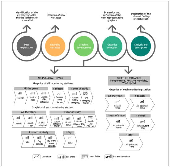 Figure 2 presents the sequence of steps developed for the preliminary visualization of the data. The first step is the data exploration, which consists in the identification of the existing variables of the original data. In the second step, the variables were analysed to decide the types of plots to be generated. In that sense, variables such as: latitude, longitude, day of the week, hour, season of the year and concentration level were added and organized. For this study it was considered that the seasons of the year in Lima are: summer (22 December to 21 March), fall (22 March to 21 June), winter (22 June to 22 September) and spring (23 September to 21 December). In the third step, the charts are designed and obtained from the most general to the most specific. Six types of graphs are presented for all-station PM concentration data, eleven types of graphs for single-station PM concentration data, and four types of graphs for data for each meteorological variable per station. For the graphs of meteorological variables, a smaller quantity has been considered, taking into account that their main variations are seasonal and hourly; these graphs also include the behavior of the recorded PM concentrations, in order to obtain a visualization with respect to the meteorology. This approach proposes several types of graphs and with increasingly specific time periods, to better observe the most critical values at different time-scales. Likewise, this type of approach allows to focus on the highest recorded values and analyze their possible causes and/or consequences. Steps 4 and 5 of Figure 2 correspond to the selection of graphs, their analysis and interpretation. The selected plots depend on the user and the objective of the analysis.