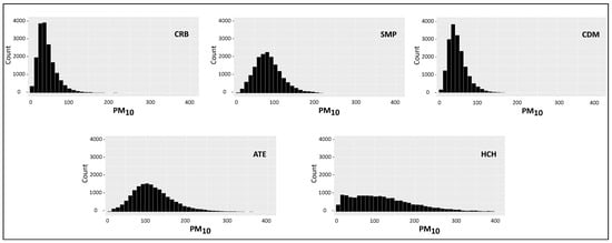 Histogram of PM for each station. The stations with the highest skewness are CRB, CDM and ATE, showing an heavy tail towards the right with respect to the mean of PM.