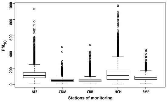 Initially, descriptive analysis of the data were carried out, covering the period between 1 January 2017 and 31 December 2018, with five monitoring stations for PM. Table 1 shows the descriptive statistics for each station, showing an asymmetry in the data. In this sense, both the histograms and the boxplots, showed in Figure 3 and Figure 4, represent the best option for visualizing PM asymmetry, allowing to evaluate the behavior in each monitoring station. Meanwhile, the PM pollutant has a heavy-tailed probability distribution (positive asymmetry), which is evidenced by the appearance of high-pollution observations.