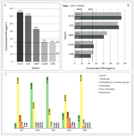 Figure 5, Figure 6 and Figure 7 show the temporal visualisation of PM concentration. For a more specific analysis, the cases in which the concentration levels were higher, have been considered. Figure 5, shows the behavior of the data in the five stations. Figure 5a shows the overall averages of the PM concentrations (from 1 January 2017 to 31 December 2018). In this period, all the stations exceed the limits proposed by the WHO for the maximum concentrations of PM in a year. In addition, all stations, except for CRB, exceed the annual arithmetic mean of PM established in the ECA. Figure 5b compares the annual averages of PM for 2017 and 2018 in each station. In this figure it is visible that the difference between the values from one year to another does not exceed 10 g/m in all stations. However, the annual average of PM in 2017 from the CRB station exceeds the concentration established in the ECA for annual average compared to that is shown in Figure 5a. In Figure 5c, the categories of Air Quality Index (AQI) from Table 2 were considered, being the percentage of hourly concentrations during the study period shown in the bar chart for each of the categories by station.