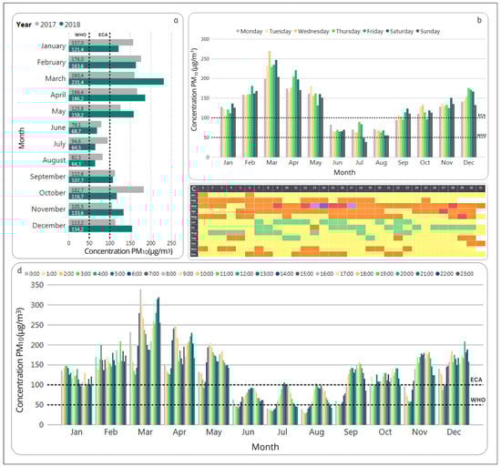 Since the highest values were reported in 2018, Figure 6b–d focus on this year. Based on Figure 6b it can be seen that the lowest concentrations are recorded on Sundays and Mondays, for most months. These results are comparable to those reported for Cali, Colombia [] where PM concentrations increased from Monday to Saturday and decreased on Sunday when traffic flow in the city also decreased notably.