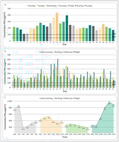 Figure 7b shows that the highest PM concentration during March was at night for three consecutive days: March 12th, 13th and 14th. On the other hand, in more than 80% of the days the early morning had the lowest PM values. Finally, Figure 7c shows that March 14 begins with very high PM concentrations between 0:00 and 1:00 in the morning. It should be noted that all hourly concentrations during March 14 exceed 170 g/m, which indicates that all values are considered by the EPA in the categories unhealthy for sensitive people, unhealthy, very unhealthy or hazardous.