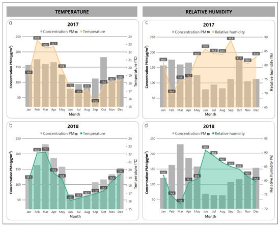 PM concentrations could be influenced by the temperature, because higher temperatures increase photochemical activity, consequently, the decomposition of matter and an increase of PM values []. Also, the high temperatures allow the re-suspension of particulate material for long periods in the atmosphere []. On the other hand, relative humidity influences the sedimentation of particulate matter at ground level, making it more difficult to transport it in the air [].