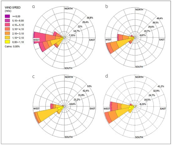 Wind roses by episodes:(a) early morning, (b) morning, (c) afternoon and (d) night in March 2018.