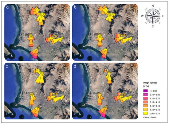 Geolocated wind roses of five air quality monitoring stations for each season in (a) summer, (b) fall, (c) winter, (d) spring of the year 2018.