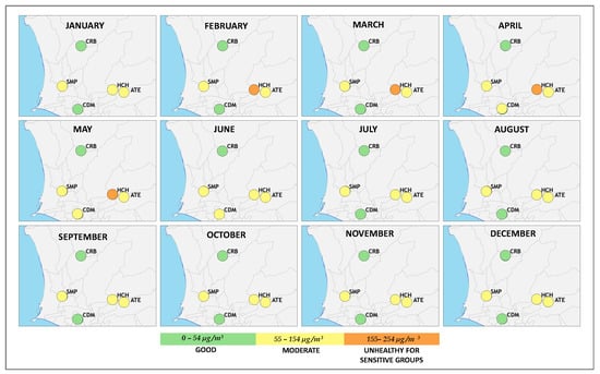 Figure 11 shows the monthly heat maps for 2018. The stations located east of Metropolitan Lima (HCH and ATE) present the highest concentrations, in contrast, the stations located in the center (CDM) and north (SMP and CRB) have the lowest concentrations. This result coincide with the work of Delgado-Villanueva and Aguirre-Loayza [], where the stations located to the east are classified as of very poor quality, while the stations in the center and south are described as of good quality.