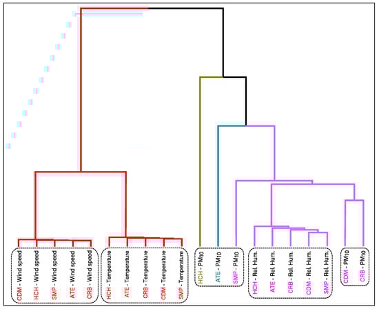 Figure 12 shows the hierarchical tree (dendrogram) considering PM and the three meteorological variables, temperature, relative humidity and wind speed, for the five monitoring stations. Aiming at clustering time series, instead of data with independent observations and a standard Euclidean distance, we considered distances based on the Dynamic Time Warping (DTW) algorithm, to obtain the dendrogram. In this way, a non-linear optimal alignment between each two time series is considered, instead of a point-by-point distance. This dynamic correlational analysis between the different time series generated differentiable clusters, such as those made up of the same meteorological variable, which indicate that the distance between the meteorological data is minimal in the five stations of Metropolitan Lima. Likewise, it is observed that the wind speed is closer to the temperature than to the relative humidity. The CDM and CRB stations present the least distance in their PM behaviour in comparison to the other monitoring stations; both register the lowest concentrations of particulate matter, and they have a smaller distance with the relative humidity group than SMP. Finally, the two groups that show the least relationship between their PM behaviour and the other variables are HCH and ATE, both stations report the highest concentrations of particulate material throughout the study period.