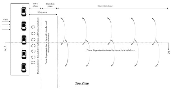 - The second flow regime (Transition Phase) is in the wake area created by wind flow. The Transition Phase includes the effect of thermal turbulence, vehicular turbulence, and atmospheric turbulence. This phase is assumed from the downwind distances of 6.5 m to 50 m. The value of 50 m will depend on the type of vehicles on the highway and could be as high as 150 m for large trucks, as pointed by Yu et al. [37];