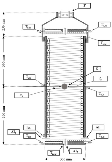 Experimental apparatus provided with fan (F), air inlets (AI1, AI2, AI3), the globe (S) and sensors for the measurement of air temperature, air velocity and heat transfer fluid temperatures (not in scale). Legend: Ti,lp: lower plate inlet thermocouple; To,lp: lower plate outlet thermocouple; Ti,lc: lower cylinder inlet thermocouple; To,lc: lower cylinder outlet thermocouple; Ti,uc: upper cylinder inlet thermocouple; To,uc: upper cylinder outlet thermocouple; Ti,up: upper plate inlet thermocouple; To,up: upper plate outlet thermocouple; TAI,2: inlet air temperature thermocouple.