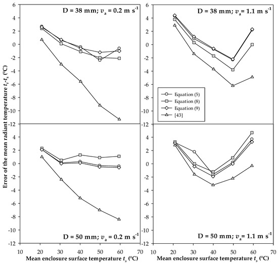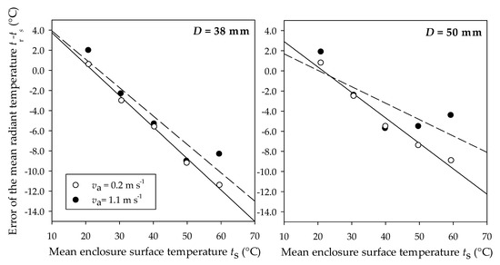 Another singularity which demonstrates the high uncertainty in the measurement of the mean radiant temperature with small globes [48,49,50,51] is that the error is a function of the enclosure temperature. In fact, while at low air velocity the error decreases quite linearly as the enclosure temperature increases, at higher air velocity and radiative loads the error increases (e.g., at ts = 60 °C for the 38 mm globe of and ts = 50 °C for the 50 mm one).