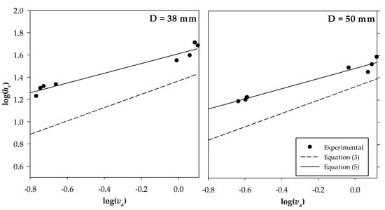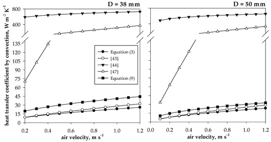 The obtained results are depicted in Figure 4 on a logarithmic scale as a function of the air velocity. The coefficients for Equations (5), (8) and (9), obtained by means of simple/multivariable regressions with Sigma Plot [66] are summarized in Table 5. Table 6 also summarizes coefficients for Equation (5) obtained in other literature studies [20,43,44,47].