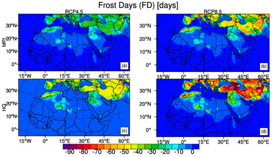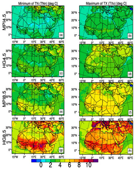 The results are presented first for temperature indices and secondly for precipitation indices in terms of the spatial patterns of changes of extreme event indices for two different RCPs, RCP4.5 and RCP8.5. The changes are displayed for the time period 2071–2100 with respect to the reference period 1971–2000 for both of the models, MPI-ESM-MR and HadGEM2-ES. Future change in temperature and precipitation indices obtained from spatial averages for sub-regions are also presented in tTables. We divided MENA region into four sub-regions based on based on the criteria described by Giorgi and Francisco [78]. We have extended Mediterranean region to 49 degrees East in order toto include all parts of Turkey. Southern boundaries for East Africa and West Africa were limited according to data boundaries of MENA region. Temporal evolution of change in some of indices throughout the century is also presented (Supplementary Figures S1–S4).