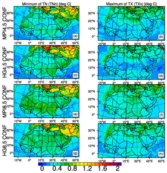 Our analysis starts with the comparison of the TNn and TXx of the two model outputs together with the two emission scenarios, displayed in Figure 1. The 95-percentile confidence range values for the period of 2071–2100 with respect to period of 1971–2000 are also given in Figure 2. The ranges are the differences between the upper and lower confidence limits. Relative to the reference period 1971–2000, Figure 1 shows a general increase in the annual minimum of TN, and the annual maximum of TX over MENA for the end of the century. The increase in TXx is greater than the increase in TNn for both scenarios and for both models. The spatial patterns of change in TNn and TXx differ from each other and the increase in TXx is stronger than TNn between the latitudes of 10 N–30 N for both models but especially for the RCP8.5 scenario, except that HadGEM2-ES RCP4.5 scenario results show somewhat similar increase for both of the indices between these latitudes. HadGEM2-ES global model shows stronger increase in both TNn and TXx compared to MPI-ESM-MR global model for both scenarios, however, the change is even more pronounced with the RCP8.5 scenario. HadGEM2-ES global model driven results also show more warming in mean temperatures than that of MPI-ESM-MR global model for the period of 2070–2100 [50]. The greatest changes in TNn, exceeding 8 C, simulated in RCP8.5 and with HadGEM2-ES are in the west African monsoon region and Southern Europe. MPI-ESM-MR gives the greatest changes in TNn over the Southern Europe with RCP8.5, exceeding 7 C. The greatest change in TXx is seen with the HadGEM2-ES in RCP8.5 and almost the whole region shows an increase more than 6 C including the Mediterranean region, west African monsoon region more than 8 C and the higher latitudes of the region more than 10 C. These regions will face severe heat stress in summer with extreme temperatures if path of RCP8.5 is followed in the future. The 95 percentile confidence range values are in between 0 to 0.8 C for all domain, except for Northern Balkan region, Turkey and Iran for minimum temperature. In the Northern Balkan region, uncertainty range increases to 1.6 C. Our results show 95% confidence that the increase in TX by the end of the century will be between 9 ± 0.8 C in the Mediterranean region. Results of this uncertainty for temperature change signal indicate that all changes can be considered robust. Our TXx results show a decrease of about 1 C around Tajikistan, however, other studies in the literature revealed cold biases of climate models over the region [50,79,80,81,82]. In contrast to HadGEM2-ES, MPI-ESM-MR projects TXx to warm more uniformly for both scenarios. For both models and for both scenarios, in terms of hot extremes, both TNn and TXx are projected to increase in the end of the 21st century.