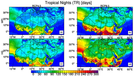 Figure 4 shows the change in TR based on the fixed 20 C threshold. Both models and both scenarios agree on an increasing trend throughout the region. Eastern Turkey and North- Eastern MENA show less increase in TR for the end of the 21st century for both models and scenarios compared to other parts of the domain. The strongest increase is in the tropical regions exceeding 150 days which is in compliance with the findings of Sillmann et al. [2]. Again, the results of HadGEM2-ES model are stronger compared to MPI-ESM-MR for both scenarios. For the worst-case emission scenario, North- Western MENA, including Canary Islands of Spain, Atlantic coasts of Morocco, Western Sahara and Mauritania as well as the Arabian Sea coast of India exhibit an increase that is more than 100 days. Central part of the MENA region shows an increase at least 60 days with both models under RCP8.5 which means nighttime temperatures in most of summer will be above 20 C threshold. Tropical nights will be expected to increase mostly over East Africa sub-region that is up to 150 days at the end of the century (Supplementary Figure S3). West Africa is also expected to have tropical nights of more than 120 days for the scenario RCP8.5. Mediterranean and Sahara region will have 83 and 98 days with nighttime temperatures greater than 20 C respectively (Table 2). Combined with the strong increase in TXx, MENA would face severe heat stress and extreme temperatures under the worst-case emission scenario RCP8.5.