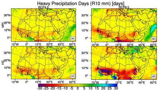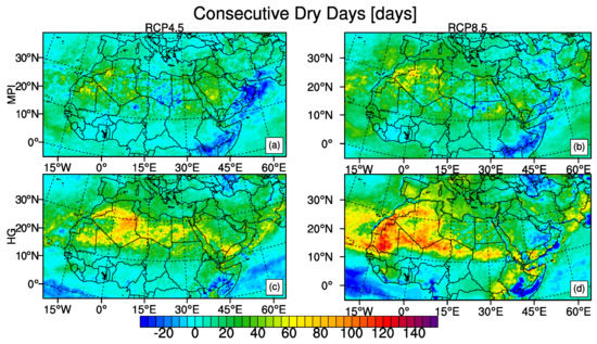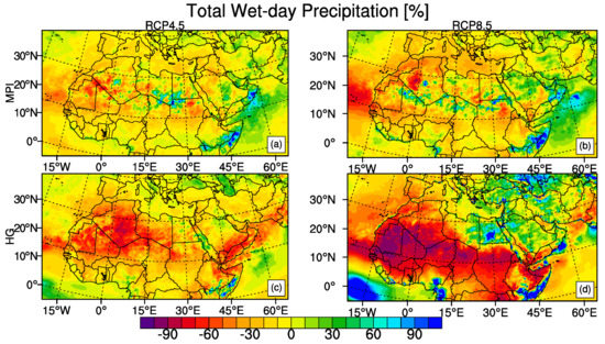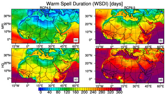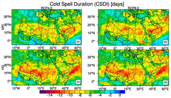 In accordance with the temperature changes at the end of the 21st century with respect to the reference period of 1971–2000, Figure 5 shows a decrease in CSDI whereas Figure 6 shows an increase in WSDI. The strongest decrease in CSDI is in central part of the region between the equator and the latitude 20 N with the reductions of 6 days and more. HadGEM2-ES model shows similar outputs under both scenarios while there is a more pronounced difference between the MPI-ESM-MR results of RCP4.5 and RCP8.5. The strongest increases in WSDI are in the tropical regions which is related to the small change in mean temperature compared to the low short-term temperature variability since WSDI and CSDI are found to be sensitive to the climatological temperature variability of the respective region [2,83]. HadGEM2-ES model under RCP8.5 projects the most drastic results of WSDI exceeding 200 days for the whole region. MPI-ESM-MR model outputs under RCP8.5 and HadGEM2-ES model outputs under RCP4.5 are comparable for regions such as northern part of the region, the Mediterranean, horn of Africa. Sahara, East Africa and West Africa sub-regions are expected to have more than 300 days with a greater maximum temperature than 90th percentile of reference period according to the result of HadGEM2-ES model under RCP8.5 (Table 3). MPI-ESM-MR model under RCP8.5 also project more than 260 days increase in WSDI over East Africa and West Africa sub-regions.