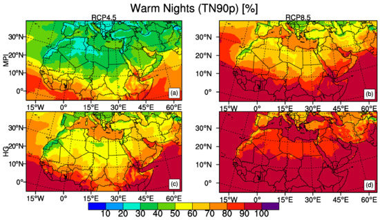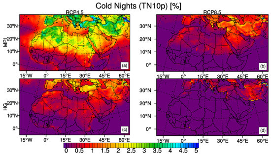Figure 7 shows the projected changes in the annual frequency of TN10p in absolute terms for the period of 2071–2100 with respect to the 1971–2000 reference period. MPI-ESM-MR model under RCP4.5 shows that TN10p decreases from about 10% in 1971–2000 to somewhere between 4% to 2.5% for northern part of MENA domain and to somewhere between 1.5% to 0% for southern part. MPI-ESM-MR model outputs under RCP8.5 and HadGEM2-ES model outputs under RCP4.5 show similar patterns and these results are in between MPI-ESM-MR with RCP4.5 and HadGEM2-ES with RCP8.5 in terms of stronger reduction of TN10p. HadGEM2-ES projection under RCP8.5 scenario shows the most severe results with almost a uniform percentage in cold nights with the values between 1% to 0% which means there will be virtually no cold nights in MENA as defined for the reference period of 1971–2000. Values close to 0% for cold nights will be observed starting from around 2020 over Sahara, East Africa and West Africa and around 2060 over Mediterranean sub-regions (Supplementary Figures S1–S4). Our results support previous studies [49,84], which found that the European and African regions show a decrease of cold nights (Tmin ≤ 5 C) for the far future period and a greater decrease is projected with RCP8.5 than with RCP4.5.