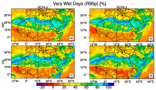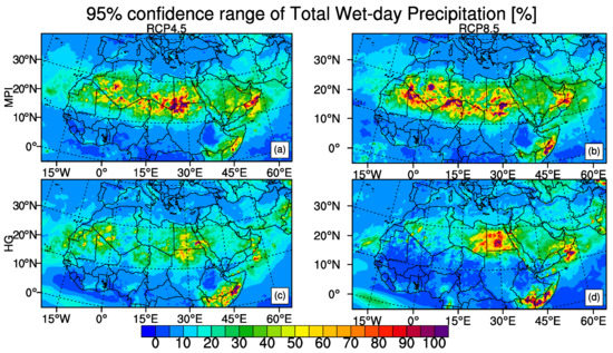 Figure 9 shows the temporally averaged PRCPTOT for 2071–2100 period as percentage differences from the reference period of 1971–2000. The 95-percentile confidence ranges of change signal for the period of 2071–2100 with respect to period of 1971–2000 are also given in Figure 10. For both model projections under both scenarios PRCPTOT has a decreasing trend in MENA for the end of the century except only small parts (Table 4). The most nonuniform and greatest change in PRCPTOT is seen with the HadGEM2-ES RCP8.5 projection which shows PRCPTOT to decrease more than 60% compared to the reference period for the Central, Southern and Eastern parts of MENA region and to increase significantly, more than 60%, for different regions in the North- Eastern MENA such as the region around Caspian Sea, Arabian Sea coast of Pakistan and Oman and also the equatorial coasts. Other three projections show PRCPTOT in Mediterranean to decrease around 10% and South Africa between 10–20%. The 95 percentile confidence range values for precipitation change between 0 and 10% almost in all parts of the domain which indicates robust change in precipitation indices except for the Sahara especially for MPI-ESM-MR results (Figure 10). The small variations in precipitation values can be resulted in high percentage values since precipitation amount itself is very low over Sahara. Results over this region can be considered insignificant. The projections of the percentile-based precipitation threshold index R95p which describes the accumulated annual precipitation amount on days when daily precipitation amount exceeds the 95th percentile threshold of precipitation distribution of the 1971–2000 base period are shown in Figure 11. For R95p, all four projections exhibit somewhat similar results and R95p is projected to increase in East and North Africa between 60–100%. MPI-ESM-MR results under both scenarios show a moderate increase of about 20 to 40% for most parts of MENA while HadGEM2-ES results under RCP8.5 scenario show 0 to 30% increase for southern MENA. Sub-regions have similar increase in R95p no matter which scenario or model while Sahara has the greatest increase where results have no significance (Table 4).