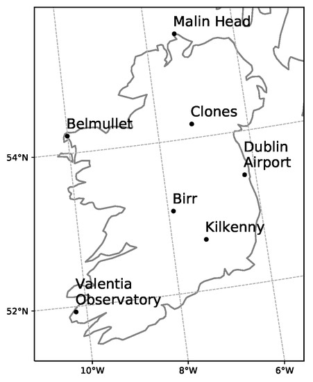 The Irish meteorological service, Met Éireann, runs a network of WMO standard weather observing stations around Ireland. In this study, we use seven stations that have a continuous record of hourly data for the three variables considered here for over 25 years, limited by the closure of some weather stations in 2008. These stations represent the longest available record of wind and SW covering different regions of Ireland (Figure 1). The locations include both coastal—Belmullet, Dublin Airport, Malin Head and Valentia Observatory, and inland stations—Birr, Clones and Kilkenny.
