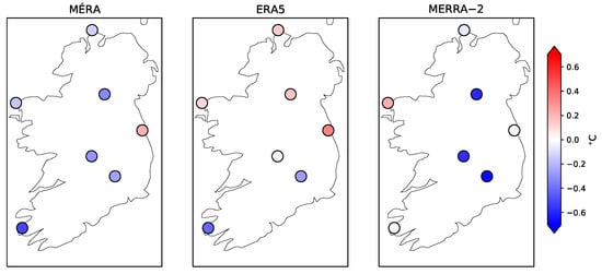 Figure 3 shows the seasonal mean and the diurnal pattern of temperature error at Belmullet, a coastal station in northwest Ireland (other stations are shown in Figures S4–S9 of the Supplementary Material). The climate at coastal locations such as Belmullet is strongly influenced by the adjacent sea surface temperatures. As the sea has a higher specific heat capacity than the land, the sea heats and cools more slowly than the land. However, if the influence of the sea is too strong in the reanalysis model, the air temperature at a coastal station will vary less during the year than it should. This seems to be the case in ERA5 and MERRA-2 at this coastal station as they have a positive bias in autumn (September, October, November: SON) and winter (December, January, February: DJF), but a negative bias in spring (March, April, May: MAM) and summer (June, July, August: JJA). This is particularly evident for all coastal stations in MERRA-2, when the cancellation of positive and negative seasonal errors lead to the small overall errors observed in Figure 3. The ME of MÉRA’s temperatures exhibits smaller changes from season to season, showing that it is better at capturing these seasonal changes in temperature both at coastal and inland stations. ME also changes less throughout the day for MÉRA compared with the other reanalyses, probably due to MÉRA’s better representation of elevation and land-use. Errors also show a diurnal variability, in which nighttime temperatures overestimate and daytime temperatures underestimate. A similar diurnal pattern is observed at all coastal stations, suggesting that land–sea interactions play a large role in the underdispersion of the variability in diurnal temperature, whereas inland stations generally display a reversed diurnal pattern, particularly in spring and summer.