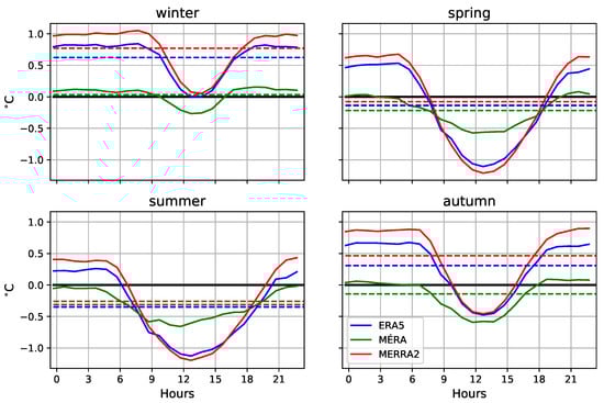 Diurnal mean error (ME) for 2 m temperature at the coastal station Belmullet in winter (DJF), spring (MAM), summer (JJA), and autumn (SON) for ERA5 (blue), MÉRA (green), and MERRA-2 (red). The horizontal dashed lines represent the overall average seasonal ME.