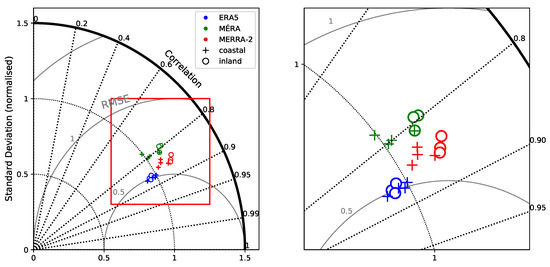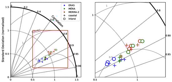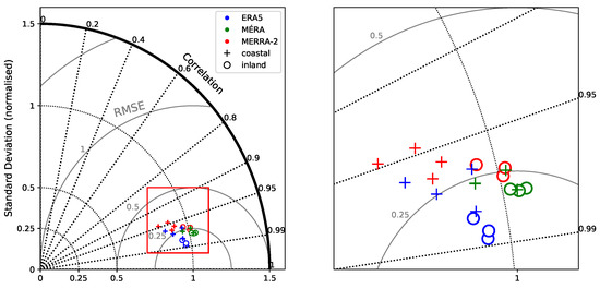 Left: Taylor diagram of 2 m temperature at all stations (coastal (+) and inland (o)) for ERA5 (blue), MÉRA (green), and MERRA-2 (red). The radial dimension represents the model normalised standard deviations, correlation coefficients are represented in angular coordinates and the arcs show the normalised centred RMSE (CRMSE). Right: close-up view of the red box in left plot.