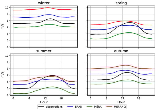 Mean 10 m wind speed at each hour at the coastal station Belmullet for winter (DJF), spring (MAM), summer (JJA), and autumn (SON) for ERA5 (blue), MÉRA (green), and MERRA-2 (red) compared with observations (black).