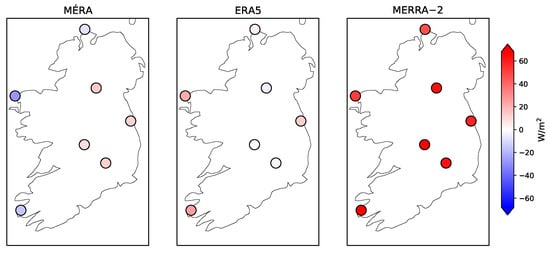 Stations located on the Atlantic facing coast (Malin Head, Belmullet, and Valentia Observatory) display a negative ME in MÉRA, whereas all other locations have a positive ME in MÉRA (Figure 7). This underestimation along the west coast of Ireland may be due to the presence of more thick clouds, which tend to have too much cloud water causing an underestimation of SW, as seen in other studies [13]. MERRA-2 and ERA5 have a positive bias in SW at all stations, mainly due to a poor prediction of cloud patterns, as seen in other studies such as [11,12].