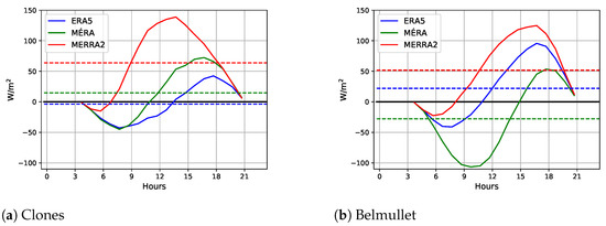 Diurnal mean SW error (ME) in summer (JJA) at (a) the inland station Clones and (b) the coastal station Belmullet for ERA5 (blue), MÉRA (green), and MERRA-2 (red). The horizontal dashed line represents the overall average seasonal ME.