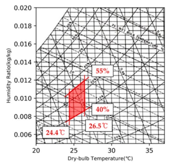 Thermal comfort is affected by various individual factors, such as age, gender, race, fitness, etc. [38,39]. Thus, we limited the thermal comfort range to apply to Koreans 19 to 24 years old. In this study, the thermal comfort range was calculated based on the comfort index, standard effective temperature (SET*). SET* is an advanced, rational model adopted by ASHRAE 55 [40] to represent thermal comfort. The comfort range in summer was determined using experiments on human subjects and measured data. The result showed that Koreans 19 to 24 years old felt comfortable when the SET* was in the range of 25.4 to 27.5 °C and relative humidity was 40 to 55% with light activity [41]. SET* can be converted to dry-bulb temperature based on the experimental relationship between the two [42]. As shown in Figure 1, the thermal comfort range can be defined as 24.4 to 26.5 °C in dry-bulb temperature, along with relative humidity ranging from 40 to 55% [4].