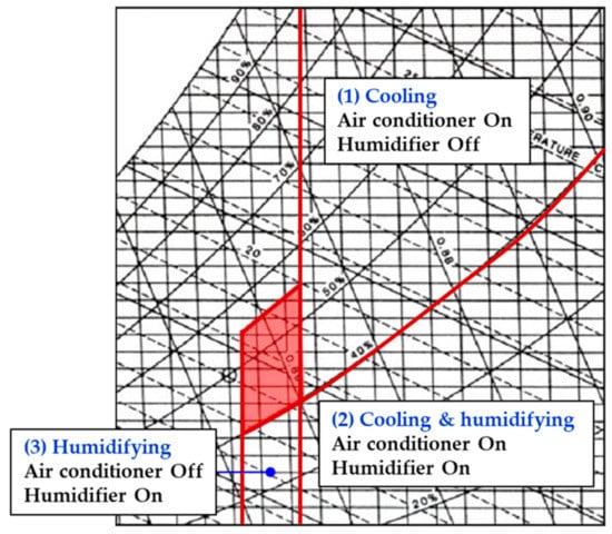 - The cooling zone is where the indoor air temperature is higher than 26.5 °C, and relative humidity is higher than 40%. In this zone, only the air conditioner operates without the humidifier because the state of the indoor air is hot and mild;
