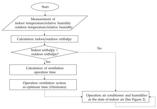 As shown in Figure 3, the first step of the ICC algorithm is to compare indoor and outdoor enthalpy to determine whether the ventilation system is required to operate. It is important because the enthalpy of air contains the sensible and latent heat that determines the cooling load. If indoor enthalpy is higher than outdoor enthalpy, the ventilation system is operated to intake outdoor air. This operation can be helpful to decrease the indoor enthalpy and to reduce the cooling load. In the second step, the operation time of the ventilation system is determined. In the previous study, the operating time was fixed at 10 min because there was no research to determine the optimal operating time of the ventilation system. After the ventilation system operates, the air conditioner and humidifier run based on the indoor air state, as shown in Figure 2 [4].