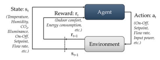 Q-learning is a model-free reinforcement learning technique that provides agents with the ability to learn to act optimally in a Markovian domain by experiencing the consequences of actions and rewards [44]. To solve sequential decision problems, reinforcement learning takes on a Markov decision process (MDP), which contains state, action, reward, and discount factors [45]. The state (st) describes the current situation of the environment. In a building environment, states can be defined as indoor–outdoor environmental conditions, such as temperature, humidity, CO2 concentration, illuminance, solar radiance and irradiance, and wind speed, or the status of indoor environmental control devices, such as setpoint, state, and physical time. The action (at) is what an agent can do in each state to try to maximize the future reward. Depending on the action performed by the agent, the next state (st+1) and reward (rt+1) are acquired from the environment. In a building environment, the state (st) can be defined as the status of indoor environmental devices, such as on–off, set point, flow rate, state (e.g., angle and dimming level), and input–output power. The reward is part of the feedback from the environment due to performing a certain action [25,46]. In a building, indoor comfort and the energy consumption of indoor environmental devices are often employed as reward factors, which involves making the indoor condition comfortable with low-energy consumption. The reward function can be described by Equation (1). The agent proceeds with learning to maximize the expected cumulative reward, Gt. The cumulative reward at each time point can be written as Equation (2). In Equation (2), γ ∈ [0, 1] is the discount factor, which is used to penalize the future reward. Figure 4 shows a framework of reinforcement learning: