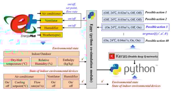 In this study, the Python module eppy was utilized to connect the control actions for the DDQN algorithm and the EnergyPlus building simulation program [48]. Figure 6 shows a schematic diagram of the co-simulation approach employed in this study. The DDQN was implemented on the Keras library, which is open-source software that provides a Python interface for the TensorFlow library. When the current state values simulated in the EnergyPlus are transferred to Python, the DDQN factors derive the optimal control action that satisfies thermal comfort with low-energy consumption based on the input state. The optimum control action is input to the control variables in association with EnergyPlus, and a simulation is performed to generate the state value of the next state. This process is repeated automatically, enabling optimal control based on environmental data.