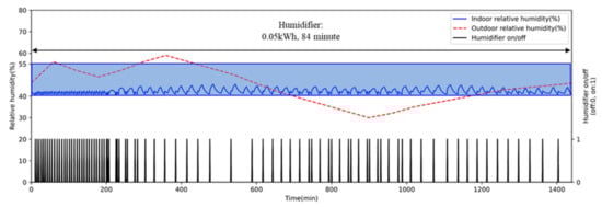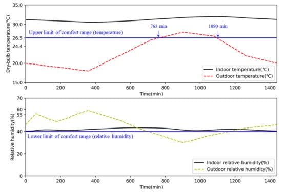 As shown in Table 6, case studies were conducted in Seoul, Korea, on 8 June, a day with hot and dry conditions when cooling and humidifying were required. Figure 8 shows the temperature and relative humidity when no devices were operating on 8 June. We selected that day as the simulation case for two reasons: (1) As shown in Figure 8, the outdoor temperature was lower than 26.5 °C, the upper limit of the thermal comfort range from 0 to 764 min and 1090 to 1440 min. In this period, we assumed that the AI2CC would fully utilize the ventilation system to decrease the cooling load by bringing in outdoor air. (2) When no devices operate, indoor relative humidity was around 40%, the lower limit of the thermal comfort range. It can be assumed that indoor relative humidity is kept under 40% when the air conditioner operates. We believed that this outdoor condition shows the efficiency of humidifier operation between the previous ICC and the AI2CC algorithm. To set the internal heat gain, we supposed that one person worked with light activity (a laptop) in the BICT (Table 6).
