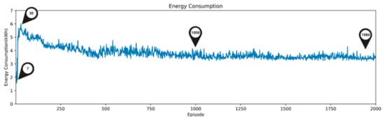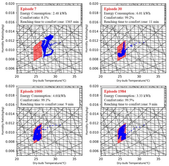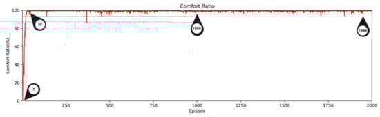 As shown in Figure 9, Figure 10 and Figure 11, energy consumption with the AI2CC decreased, while the comfort ratio increased as the DDQN learning process went on. In the early stage (1–30 episodes) of DDQN learning, the agent started off acting randomly to generate simulation data to learn the optimal action. Because of the agent’s randomization, in this stage, there were cases where the comfort ratio was too low (episode 7: energy consumption 2.48 kWh, comfort ratio 0.1%) and energy consumption was too high (episode 30: energy consumption 6.01 kWh, comfort ratio: 99.1%).