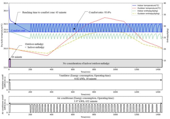 Table 7 shows that the room with AI2CC reached the comfort zone 54.1 min faster than the one with ICC. Additionally, the comfort ratio of AICC was 99.4%, which was 6.4% higher compared to ICC. As shown in Figure 12, ICC operated the ventilation system and air conditioner separately based on the specified sequence. This rule-based control of ICC caused inefficient control by operating the ventilation system for only 10 min even though the room could reach the comfort zone faster by using the ventilation system and air conditioner at the same time. According to Figure 14, AI2CC showed a different method from ICC by operating the air conditioner and ventilation system simultaneously to take in low-enthalpy outdoor air. This operation decreased the time to reach the comfort zone and helped increase the comfort ratio.