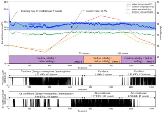 To be specific, in terms of the ventilation system, ICC operated the ventilation system for only 10 min, consuming 0.02 kWh before the air conditioner began running (see Figure 12). This operation aimed at reducing the cooling load by exchanging high-enthalpy indoor air and low-enthalpy outdoor air, as mentioned in Section 3.2. With AI2CC, the ventilation system used 1.15 kWh for one day (1440 min), showing different on–off statuses depending on the indoor and outdoor enthalpy variations. As shown in Figure 14, we divided one day into three phases according to the indoor and outdoor enthalpy to explain the operation of AI2CC. For phases 1 and 3 with higher indoor than outdoor enthalpy, AI2CC mainly operated the ventilation system for 407 min out of 724 min (phase 1) and 159 min out of 330 min (phase 3). When outdoor enthalpy was lower than indoor enthalpy, AI2CC utilized the ventilation system to bring cool air from the outside to reduce the cooling load. On the contrary, there was no ventilation system operation in phase 2, when outdoor enthalpy was higher than indoor (see Figure 14). This shows that AI2CC learned the availability of operating the ventilation system according to indoor and outdoor enthalpy to reduce total energy consumption.