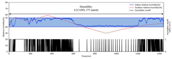Concerning the operation of the humidifier, ICC turned it on and off repeatedly at a relative humidity of around 40%. Thus, indoor relative humidity was maintained at around 40%, consuming 0.05 kWh of electricity (see Figure 13). On the contrary, the indoor relative humidity of AI2CC was well maintained between 40 and 60%, indicating a relatively wider distribution than ICC (see Figure 15). This caused AI2CC to use more energy consumption for the humidifier than ICC.