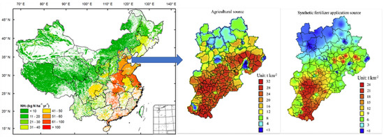 The spatial distribution of NH3 emissions in China [29] and the spatial distribution of agricultural and synthetic fertilizer application sources in the Beijing-Tianjin-Hebei region [72].